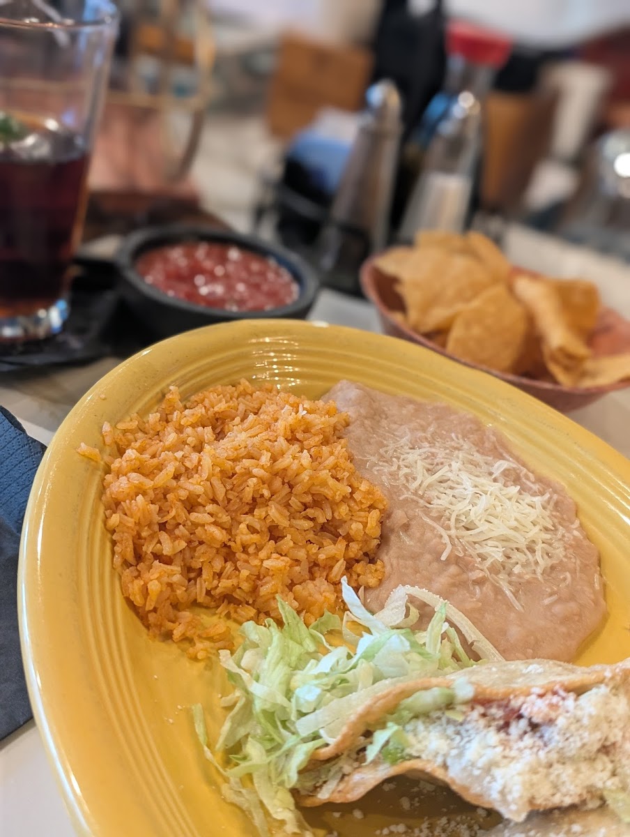 Very simple looking restaurant, they were really packed, but I was still checked on often. Ordered basic combo plate, two crunchy shredded beef tacos, beans and rice. It came out amazingly fast considering how busy they were. Food was delicious, rice is full of flavor, beans nice and creamy. Perfect amount of beef in the tacos and they were nice and crunchy. Everything went perfect with my margarita. I will be back to try more things!