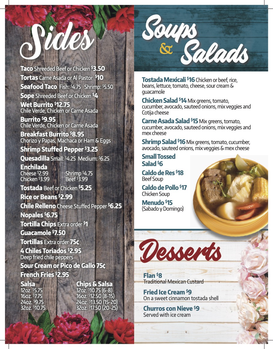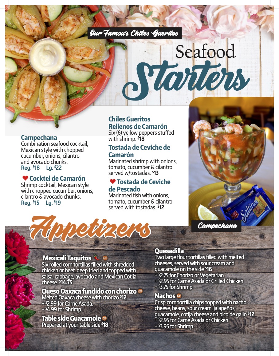 For lunch or dinner, the menu features familiar favorites served with classic sides such as rice and beans. Combination plates let you enjoy a variety of tastes, from crunchy tacos and enchiladas to chile rellenos. Seafood lovers can find items made to share, like platters with shrimp, fish fillets, and ceviche, which bring a refreshing, flavorful touch to the table.